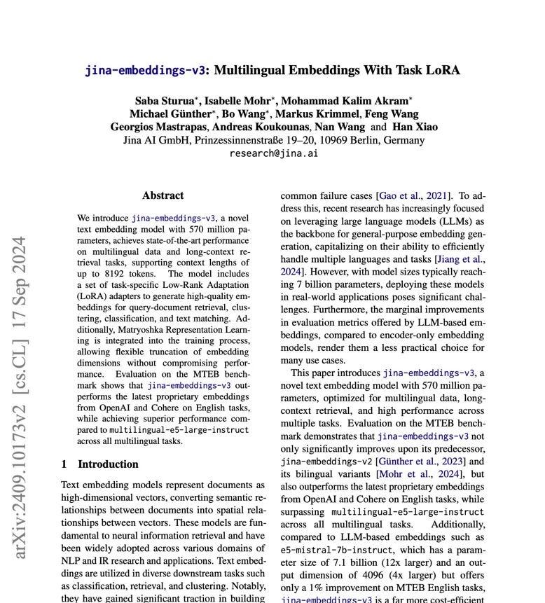 jina-embeddings-v3: Multilingual Embeddings With Task LoRA