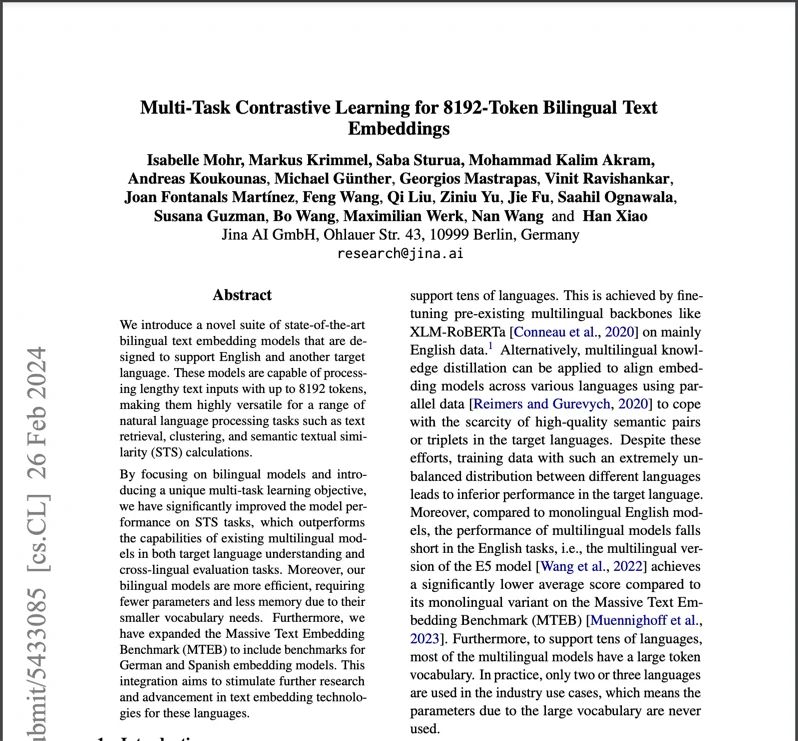 Multi-Task Contrastive Learning for 8192-Token Bilingual Text Embeddings